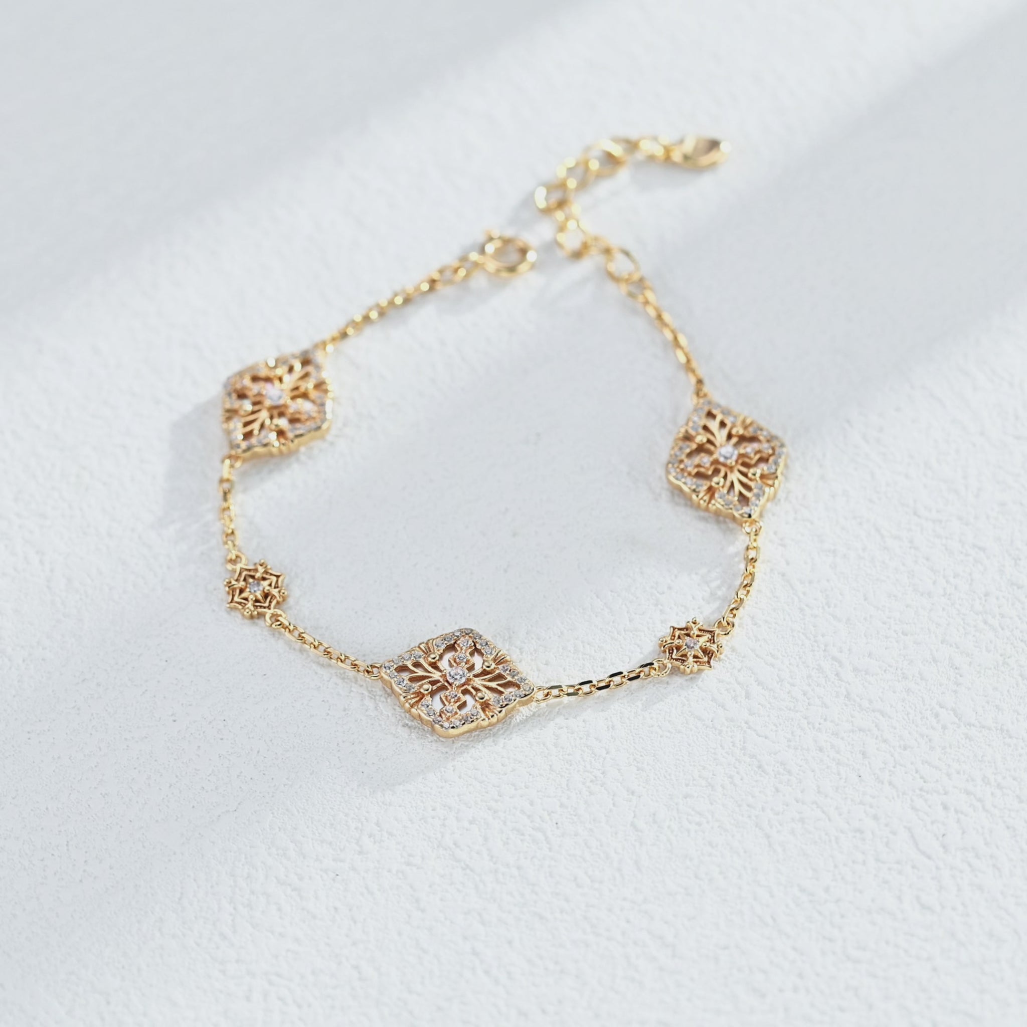 Crafted with intricate symmetry and timeless elegance, the Aurelle Quatrefoil Bracelet is a statement of quiet strength and refined beauty. Featuring delicately sculpted quatrefoil motifs adorned with shimmering cubic zirconia, this bracelet reflects light from every angle, creating a soft yet captivating glow.