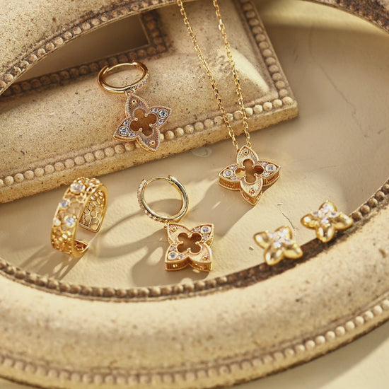 Timeless, feminine, and beautifully symbolic, the Aurelle Quatrefoil Earrings and Necklace blends a heritage-inspired silhouette with contemporary sparkle. Each piece features the iconic quatrefoil motif, long celebrated in European design as a symbol of luck, protection, harmony, and grace. Intricate etched detailing creates soft texture and depth, while brilliant cubic zirconia stones illuminate the center of each petal.